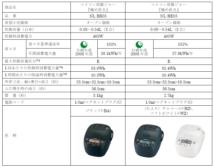 ※6 消費電力量は、炊飯量、ご使用のメニュー等によって異なります小容量マイコン炊飯ジャー「極め炊き」(NL-BX05型) ニュースリリース