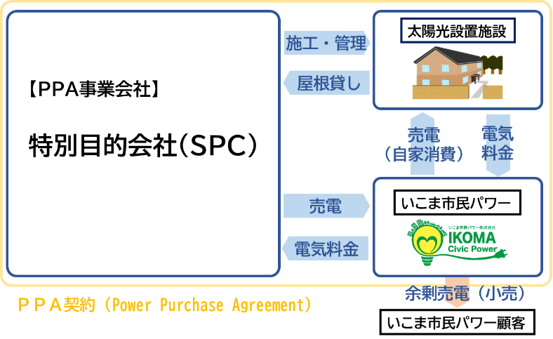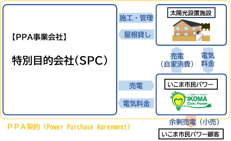 ◇本事業はSPC、施設管理者、ICPの3者間でのPPA事業モデルとし、各施設で自家消費しきれない余剰電力も、ICPの再エネ電力として他の顧客への電力供給に活用することを想定。