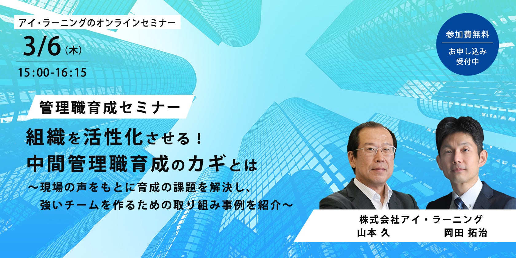 デジタル人材の育成をリードする株式会社アイ・ラーニング(本社:東京都中央区、社長:杉山 真理子)は、3月6日、無料のオンラインセミナー 『管理職育成セミナー:組織を活性化させる!中間管理職育成のカギとは』 を開催いたします。