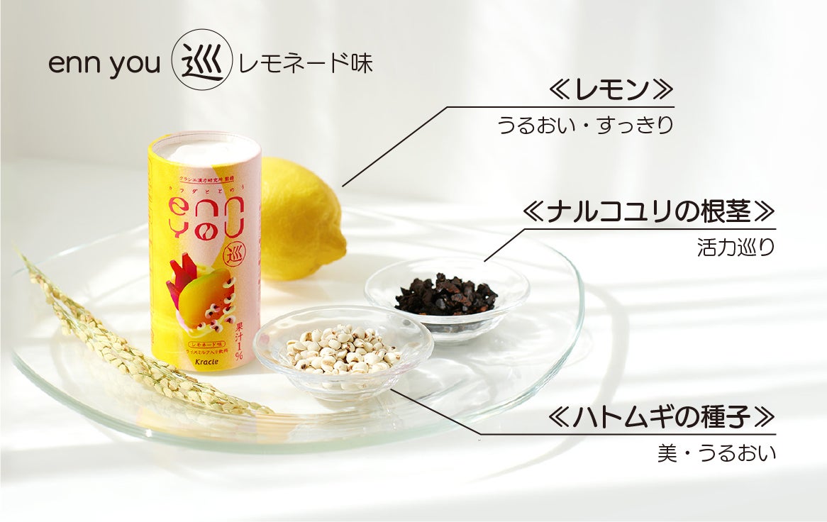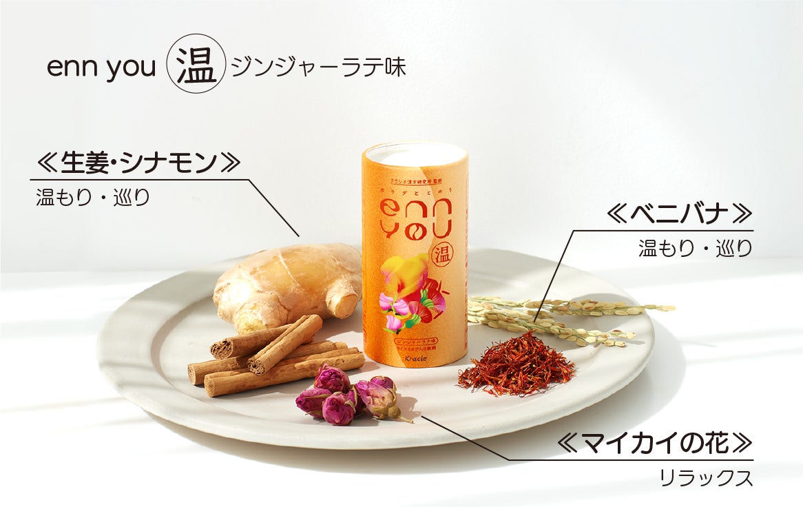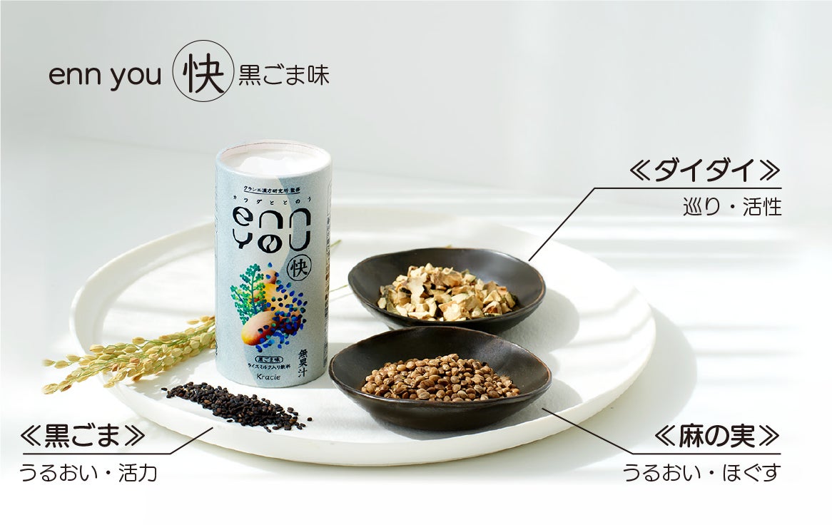 「カラダととのうenn you」は、ライスミルクをベースに、和漢エキスを配合したドリンクです。今の自分を整え、未来の健康的な自分を創るために、日常で飲みやすく続けやすいドリンクを目指しました。フレーバーは、「enn you 巡 レモネード味 / 温 ジンジャーラテ味 / 快 黒ごま味」の3種類の展開です。