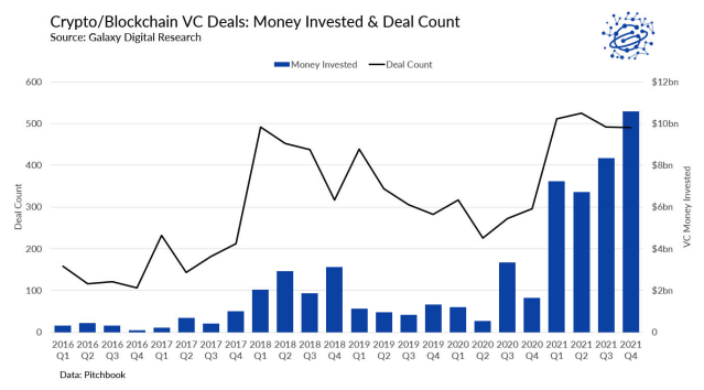 2022年4月時点において日本国内のWeb3(Crypto・NFT・Blockchain)領域のスタートアップの資金調達事例は数えるほどしかない現状にありますが、グローバルでは下記のチャートのように、2021年4Qでは$10B以上・500件以上のスタートアップがVCからの資金調達を受けています。SV4号ファンドでは、Web3スタートアップを多数インキュベーションする事で世界市場へより良いプロダクトを届けたいと考えています。