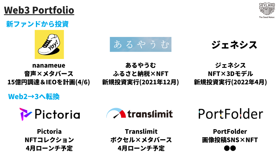 Skyland Ventures4号ファンドから、既にWeb3分野のスタートアップへ6社へ投資もしくは投資合意に至っております。Web3スタートアップとして、ゼロから始まった会社もあれば、既存の投資先からWeb3領域への転換を支援し追加投資に至った会社も含まれています。