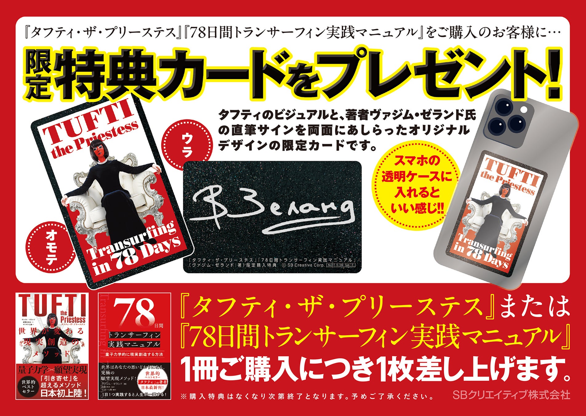『タフティ・ザ・プリーステス』または『78日間トランサーフィン実践マニュアル』いずれか1点をご購入いただいた方に、数量限定で特典カードを差し上げます。