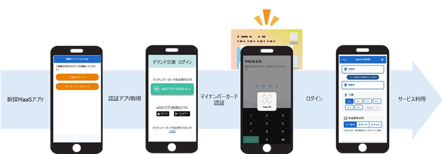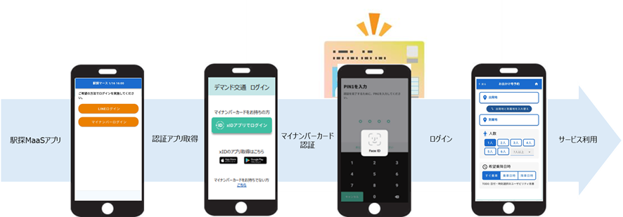駅探MaaSソリューションではxID(クロスアイディ)社の個人認証アプリ「xIDアプリ(※2)」と連携し、マイナンバーカードを活用したユーザ認証機能やアプリログイン機能を提供いたします。