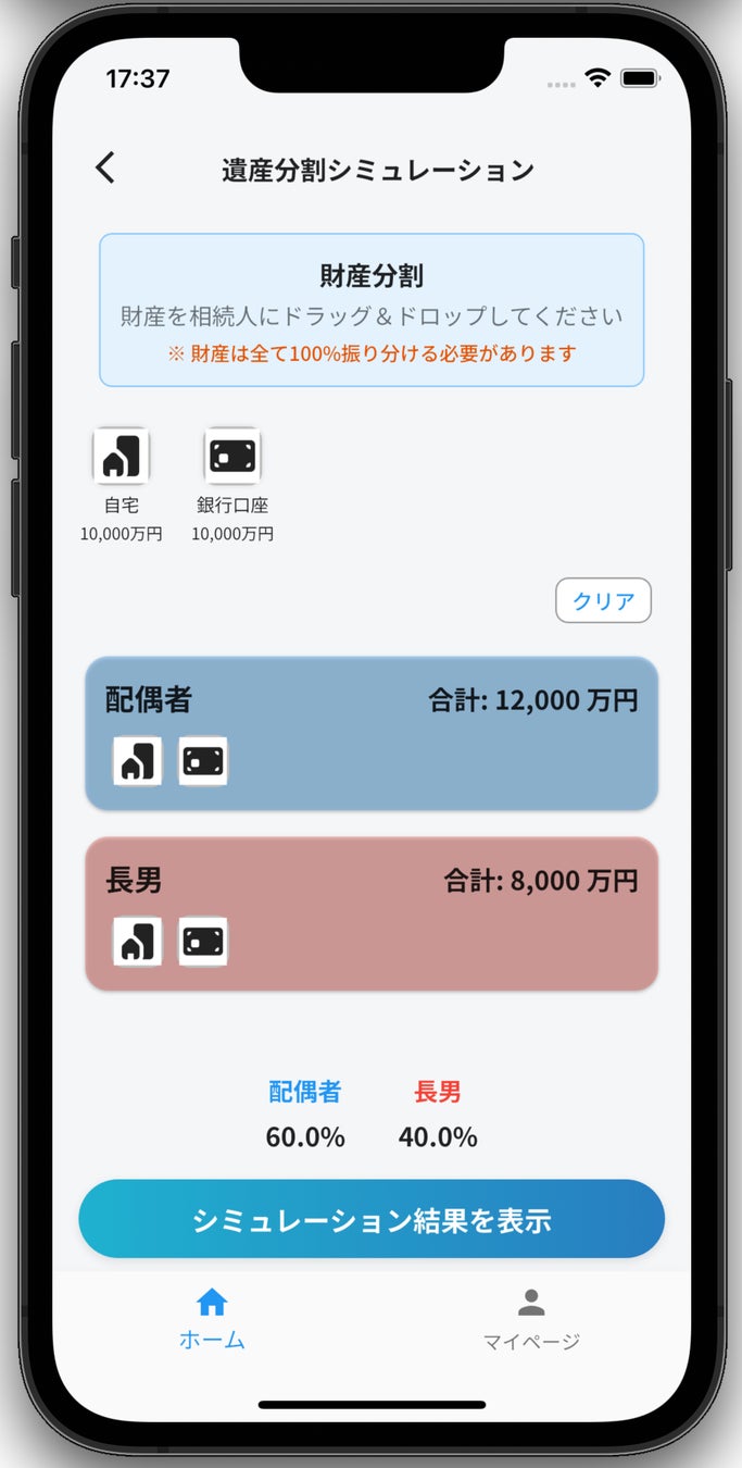本機能では、アプリ内で簡単な操作を行うだけで相続人への財産振り分けや、相続人ごとの相続税と手取り額の目安を確認できます。