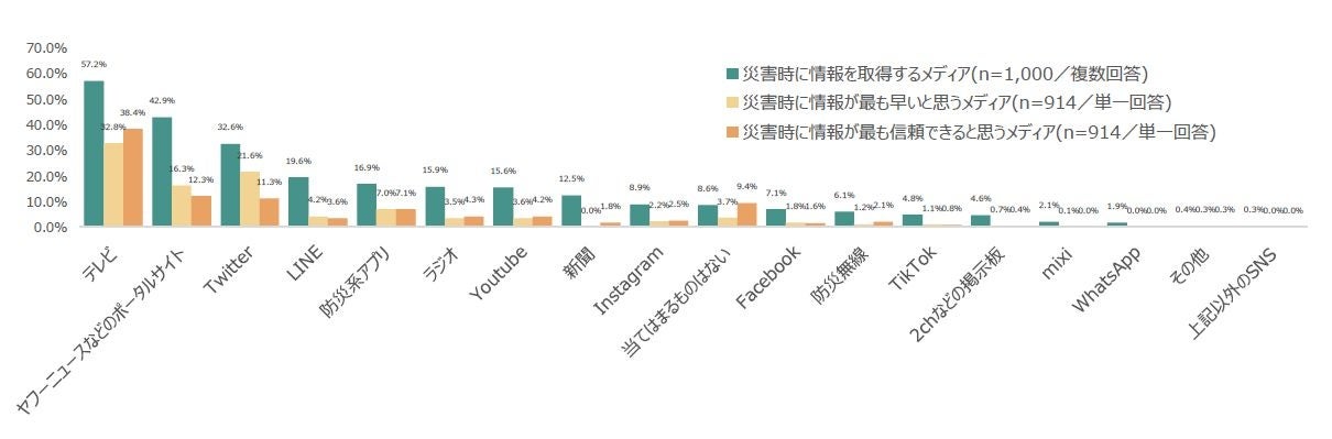 ※メディアに関しての選択肢はTwitter、Facebook、Instagram、YouTube、Tiktok、mixi、LINE、WhatsApp、上記以外のSNS、ヤフーニュースなどのポータルサイト、2chなどの掲示板、テレビ、新聞、ラジオ、防災系アプリ、防災無線、その他、当てはまるものはないから複数選択で回答