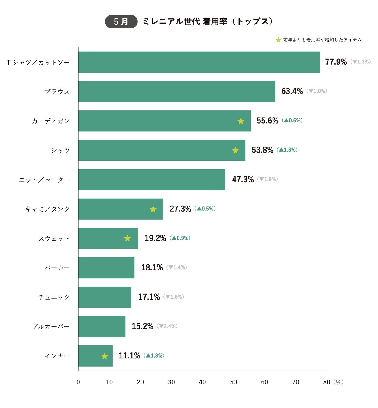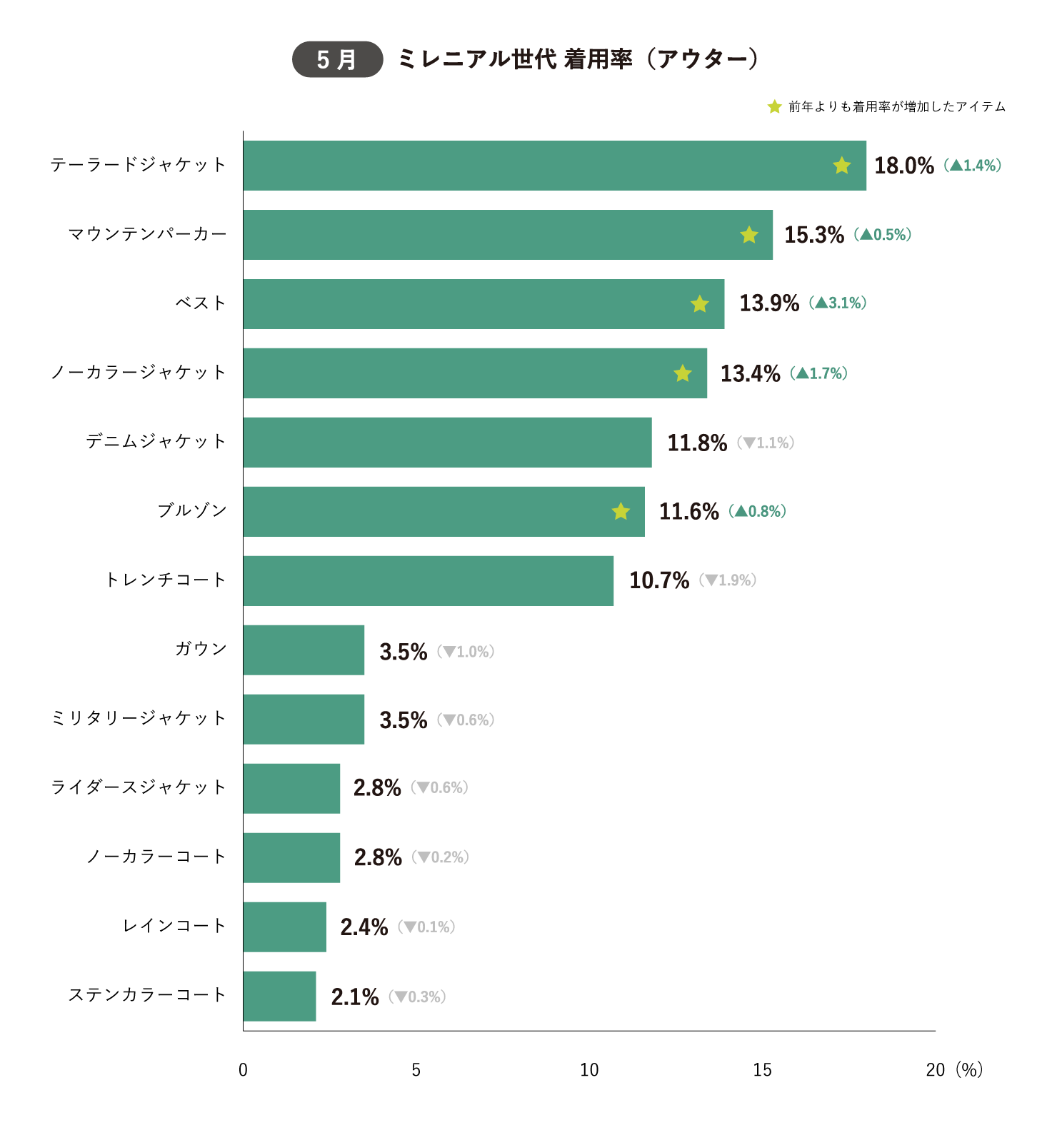 5月に入り気温が上昇したことにより、アウター類の着用率は全体的に低くなっています。お仕事から普段着まで幅広く着回せる「テーラードジャケット」「ノーカラージャケット」は着用率が13.4%〜18%となり、5月まで着用できるアウターとして活用されていることが分かりました。トレンドアイテムの「ベスト」は、前年同時期と比較して着用率が▲3.1%増加し、ミレニアル世代女性の約7人に1人が着用しています。