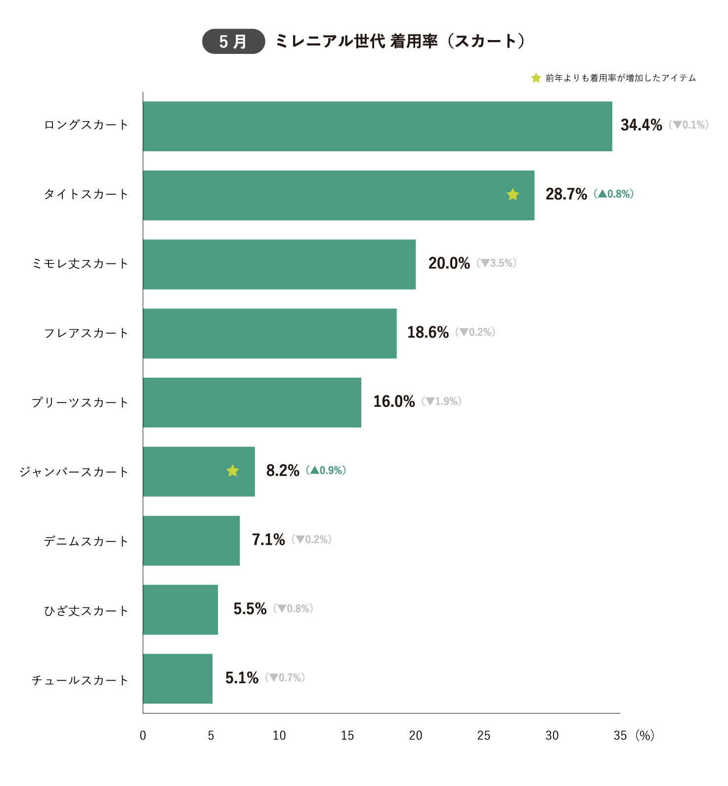 スカートの場合は、丈が長い「ロングスカート」の着用率が34.4%と最も高く、スッキリとしたシルエットが特徴の「タイトスカート」「ジャンパースカート」は前年同時期と比較して着用率が▲0.8%〜▲0.9%増加しています。一方で丈が短い「ミモレ丈スカート」「ひざ丈スカート」の着用率は前年と比較し▼0.8%〜▼3.5%減少傾向であることが分かりました。