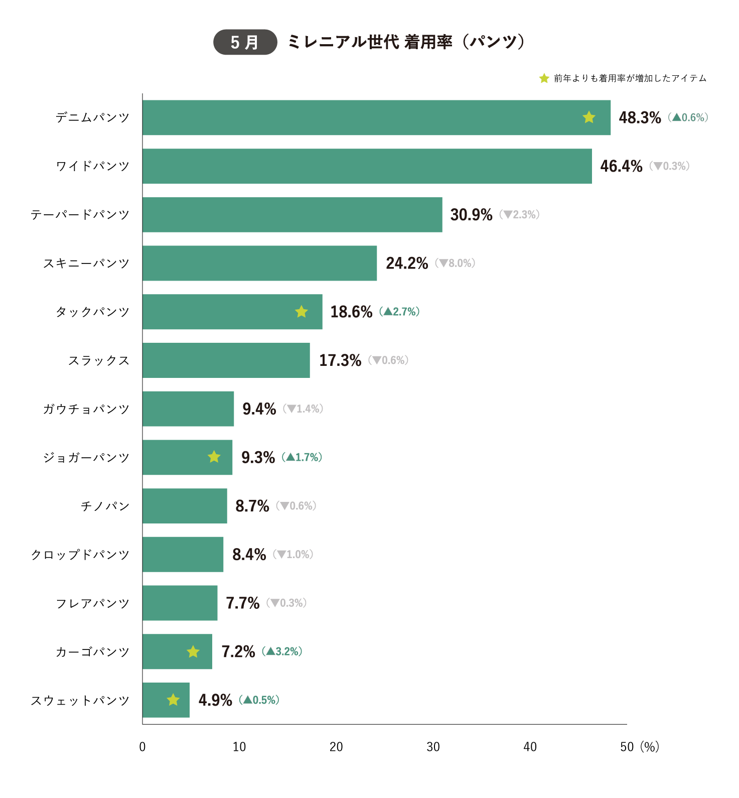 ボトムスの内パンツに関しては、「デニムパンツ」「ワイドパンツ」の着用率が46.4%〜48.3%と最も高く、ミレニアル世代女性の約2人に1人が着用しています。トレンドアイテムの「カーゴパンツ」は、流行の影響から前年同時期と比較して着用率が▲3.2%増加していることが分かりました。他にも「ジョガーパンツ」「スウェットパンツ」といった動きやすくカジュアルな印象のパンツも前年と比較し着用率が増加している傾向です。