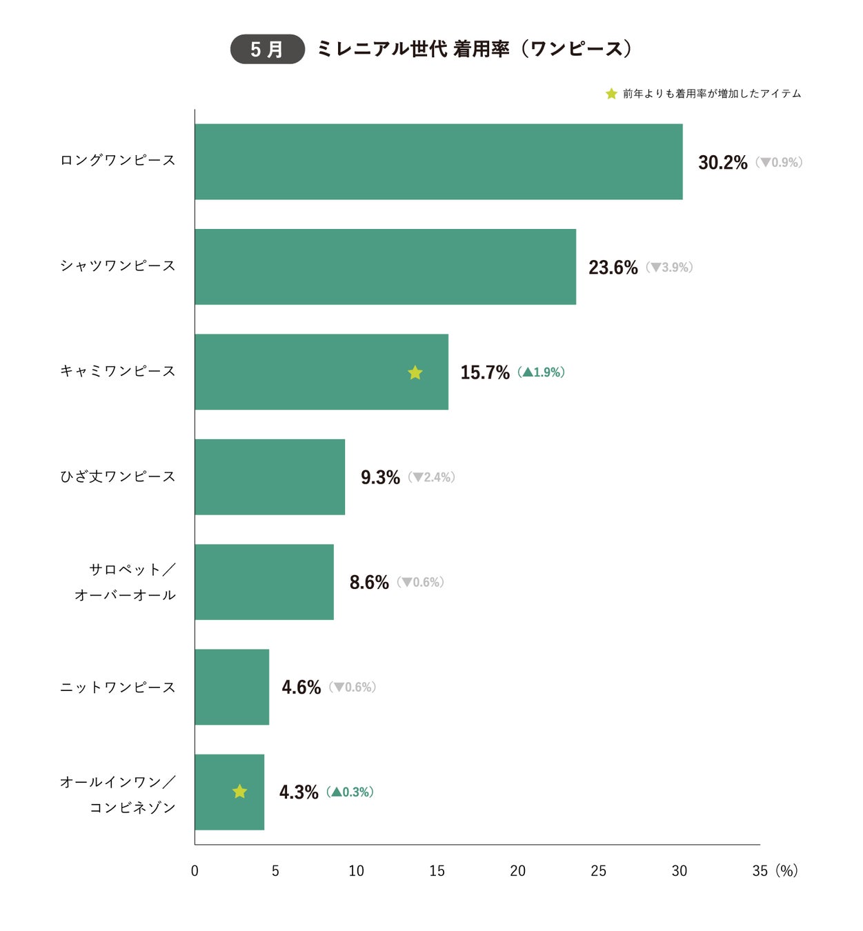 スカートと同様に、ワンピースの場合も着丈が長い「ロングワンピース」の着用率が30.2%と最も高く、着丈が短い「ひざ丈ワンピース」の着用率が前年同時期と比較して▼2.4%減少しています。2023年5月は「キャミワンピース」の着用率が前年と比較し▲1.9%増加し、約6人に1人が重ね着のコーディネートを楽しんでいることが分かりました。
