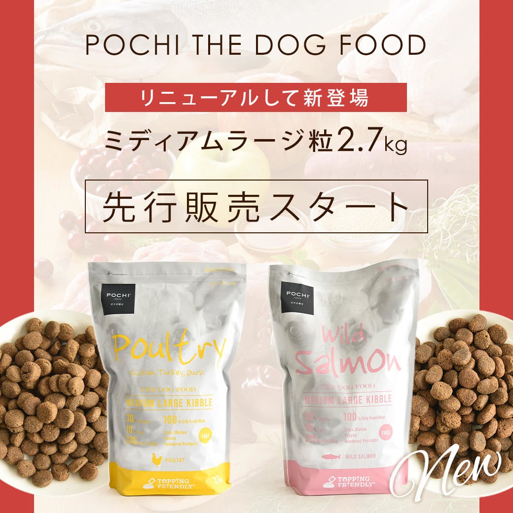 プレミアムドッグフード専門店・通販「ポチの幸せ(POCHI)」(運営:マーケティングパートナー株式会社、本社所在地:東京都新宿区、代表取締役社長:権田真司、Tel:03-6772-8194)は、生肉100%※使用で嗜好性の高いオリジナルフード「POCHI ザ・ドッグフード ベーシック」シリーズ(AAFCO、FEDIAF総合栄養食基準適合)の、中・大型犬向けのミディアムラージ(ML)粒をリニューアルするとともに、新たに『ワイルドサーモン』が新登場。『3種のポルトリー』(チキン生肉、ターキー生肉、ダック生肉の3種)とともに、2.7kgサイズ(4,635円(税込))を「ポチの幸せ」公式サイトのみで8月2日(火)より先行発売を開始しました。