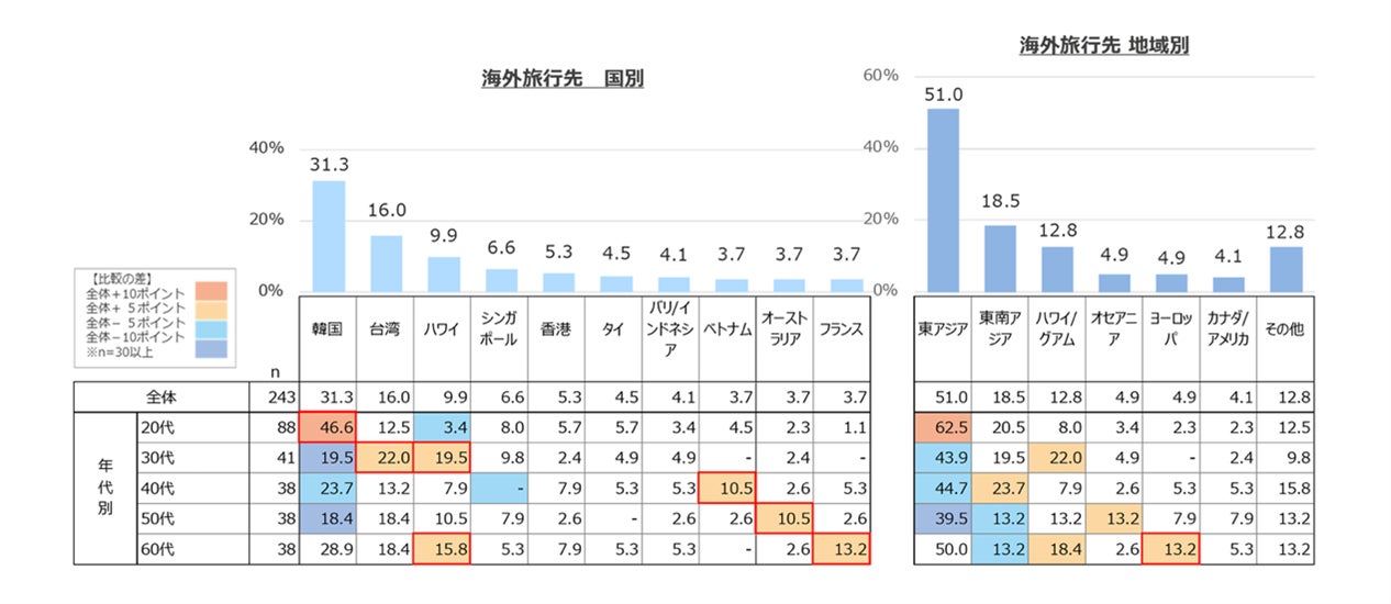 「ハワイ」が9.9%という結果に。地域別では「東アジア」次いで「東南アジア」「ハワイ/グアム」と続きます。