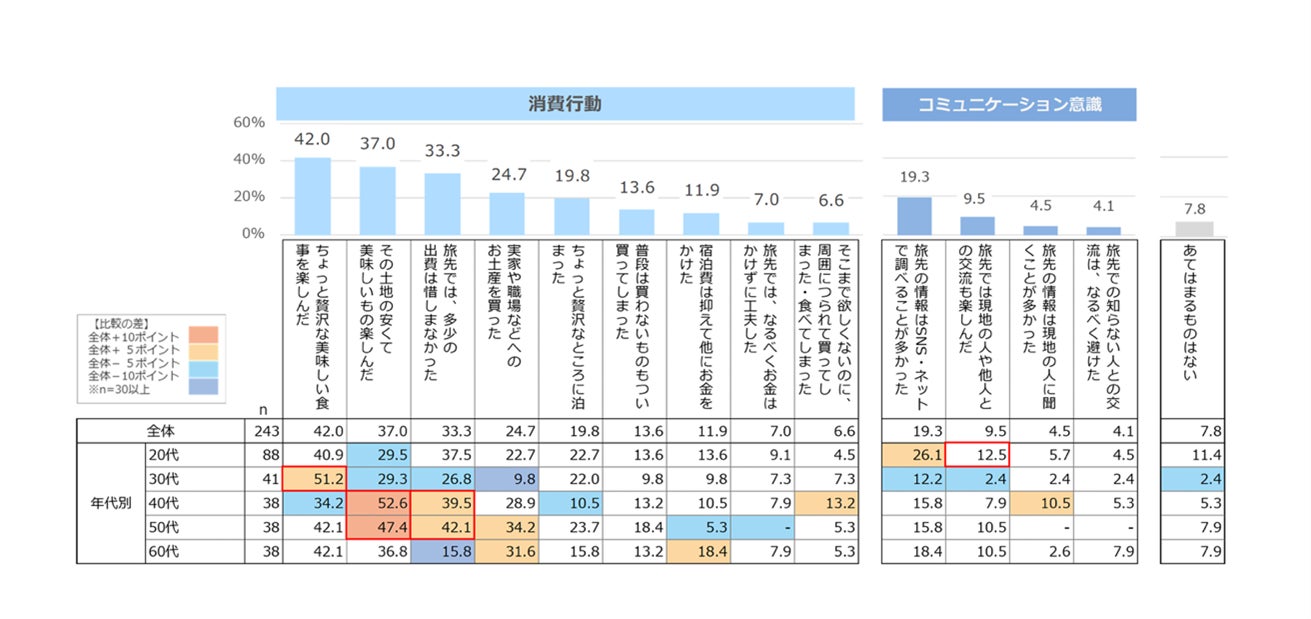 また、旅行先での消費行動・コミュニケーション意識について、20代は現地の人とのコミュニケーションを重視する人が他の年代に比べて多く、30代はちょっと贅沢な食事、40~50代はその土地の安くて美味しい食事を求め、逆にその他の消費を惜しまないという、年代ごとの特徴が見られます。