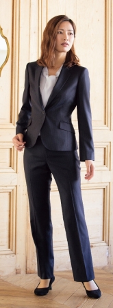 “360度どこから見てもキレイ”をコンセプトに開発した、女性らしいキレイで品のあるシルエットラインが特長の「ソフトカービーシルエット」を採用。シルエット美を実現しながらも、ジャケットの袖裏に袖通しが良いキュプラを混合したストレッチ素材のほか、スーツの表地にもストレッチ素材を使用し、快適な着用感も両立しています。さらに、ノーカラージャケットやワイドパンツを採用するなど、お手持ちのスーツとは違った“オシャレ”をより楽しめるデザインを採用しています。