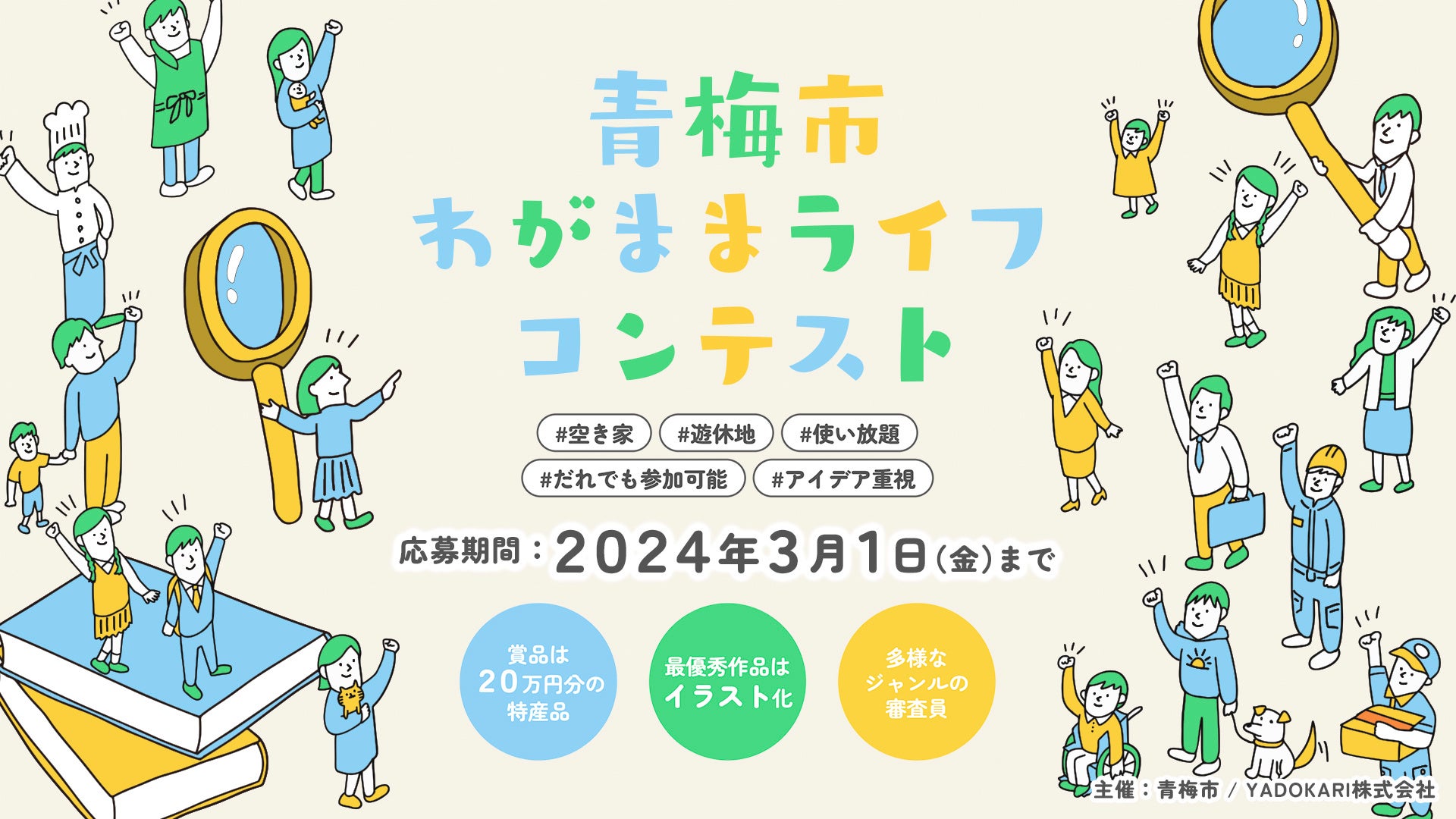 東京都内でありながらも豊かな自然環境に囲まれた青梅市と空き家ゲートウェイを始め、遊休不動産と可動産の活用を手がけるYADOKARIがタッグを組み、「青梅市わがままライフコンテスト2023」を開催いたします!