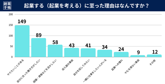 続いて「自分に合った働き方がしたい(89名)」「経験・資格などを活かしたい(58名)」の回答者数が多いことから、職場で実現できない働き方がしたいが起業理由となっています。