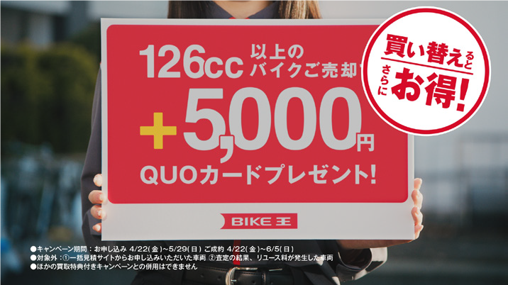 「まだ世界にない、感動をつくる。」をコーポレートミッションに掲げ、ビジョンである「バイクライフの生涯パートナー」の実現に向けて、事業を展開する株式会社バイク王&カンパニー(代表取締役社長執行役員:石川秋彦、本社:東京都港区、証券コード:3377、以下「当社」)は、2022年4月22日(金)より買取強化のキャンペーン、「2022年その場でもらえる5,000円キャンペーン」(以下「当キャンペーン」)を実施いたします。それに合わせ当社イメージキャラクターである、つるの剛士さん出演のキャンペーンCM『バイクのキモチ 126cc以上CP』篇(以下「本CM」)を放映いたします。