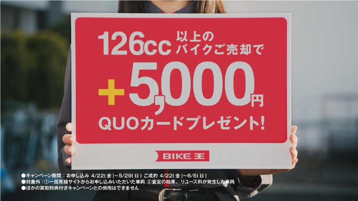 | キャンペーン内容 | 上記お申し込み期間中に当社へ無料出張買取をお申し込みいただき、126cc以上のバイクをご売却いただいた方に「5,000円分のQUOカード」を買取当日その場でプレゼント。 |
