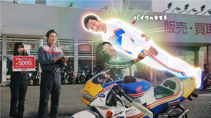 今回来店したのは、バイクを売ろうとしたものの、愛車を手放すのをためらい「やだーー」と叫ぶお客様。そんなお客様に「126cc以上のバイクをご売却で、5,000円分のQUOカードをプレゼントするキャンペーン」について優しく伝える「うるのたかし店長」。そして突然出てきた「バイクのキモチ」からの「別れがあるから、出会いがあんだろ」と渋~い後押しのセリフにやられたお客様は売却を決意します。コミカルなCMをぜひご覧いただくとともに、「2022年その場でもらえる5,000円キャンペーン」のほか、バイクの買い替えや免許取得をお考えの方もお得なキャンペーンも同時に実施しておりますので、この機会に是非ご利用ください。