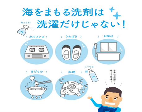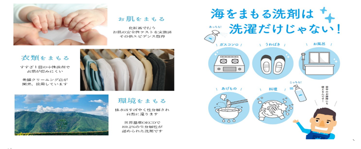 『海をまもる洗剤』は、世界基準(OECD)で、89.2%の生分解性が認められることから、排水は自然に還ります。衣類や靴の洗濯だけでなく、キッチンの汚れなど掃除にも利用できることから、1種類の洗剤ですみ、ボトルは再利用できるのでプラごみ削減につながります。