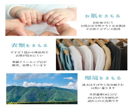 すすぎ1回で衣類が傷みにくく、排水が素早く生分解され、自然に還ります。