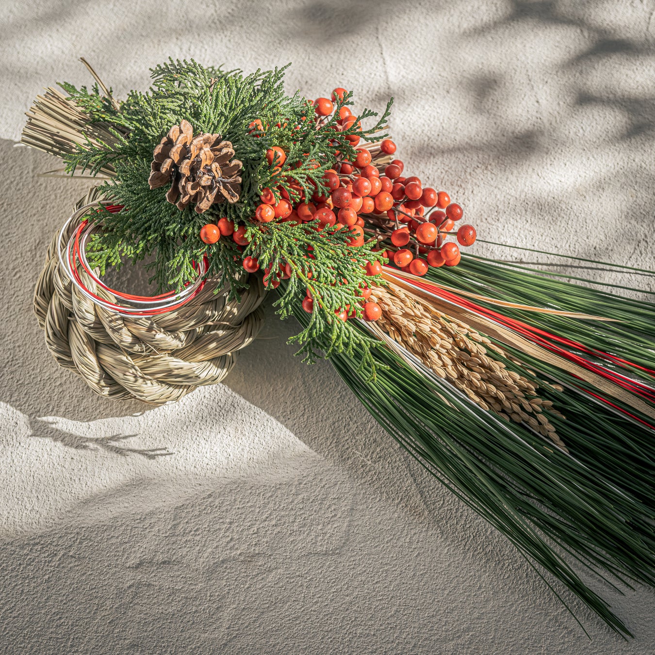 常緑のヒノキと紅白の水引を添え、たわわに実るのは上品な紅みのイイギリ。