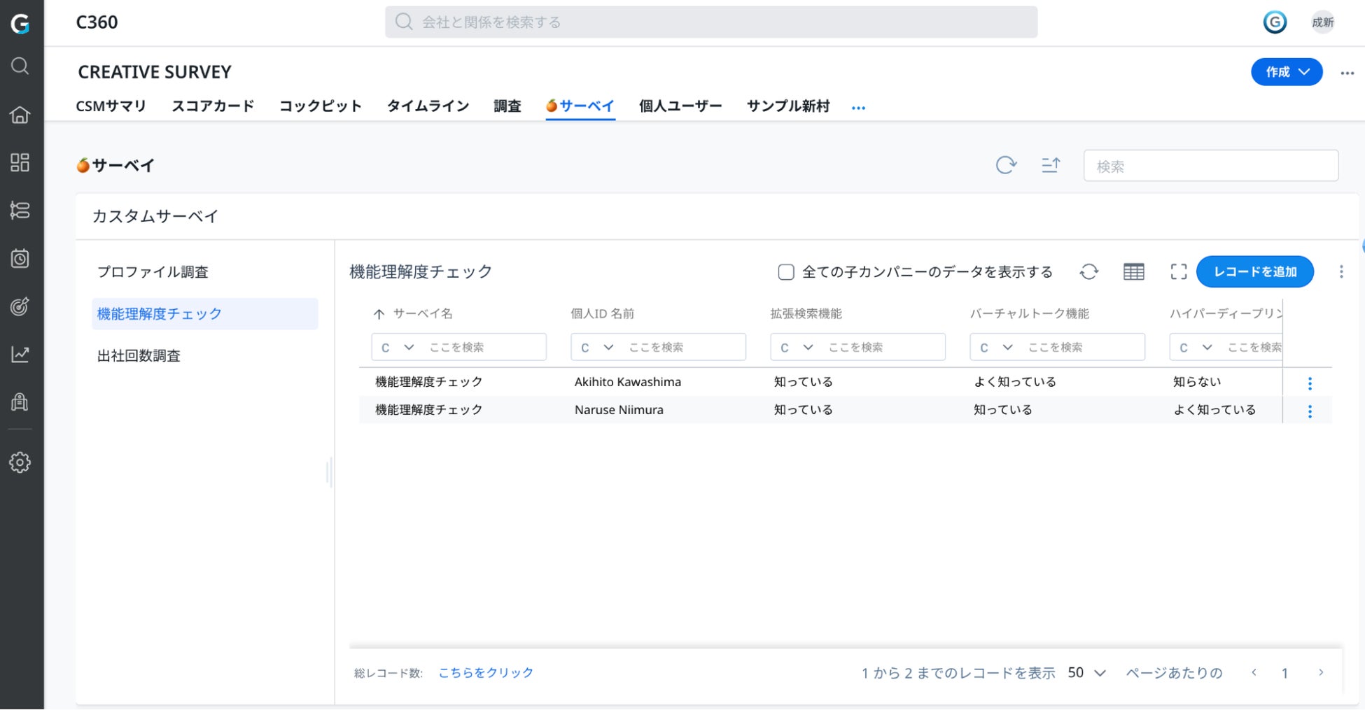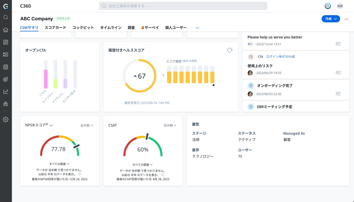 連携されたデータは顧客ごとのカスタマー360に表示させることで、カスタマーサクセス担当者はお客様の状況を把握して適切な対応を行うことができます。