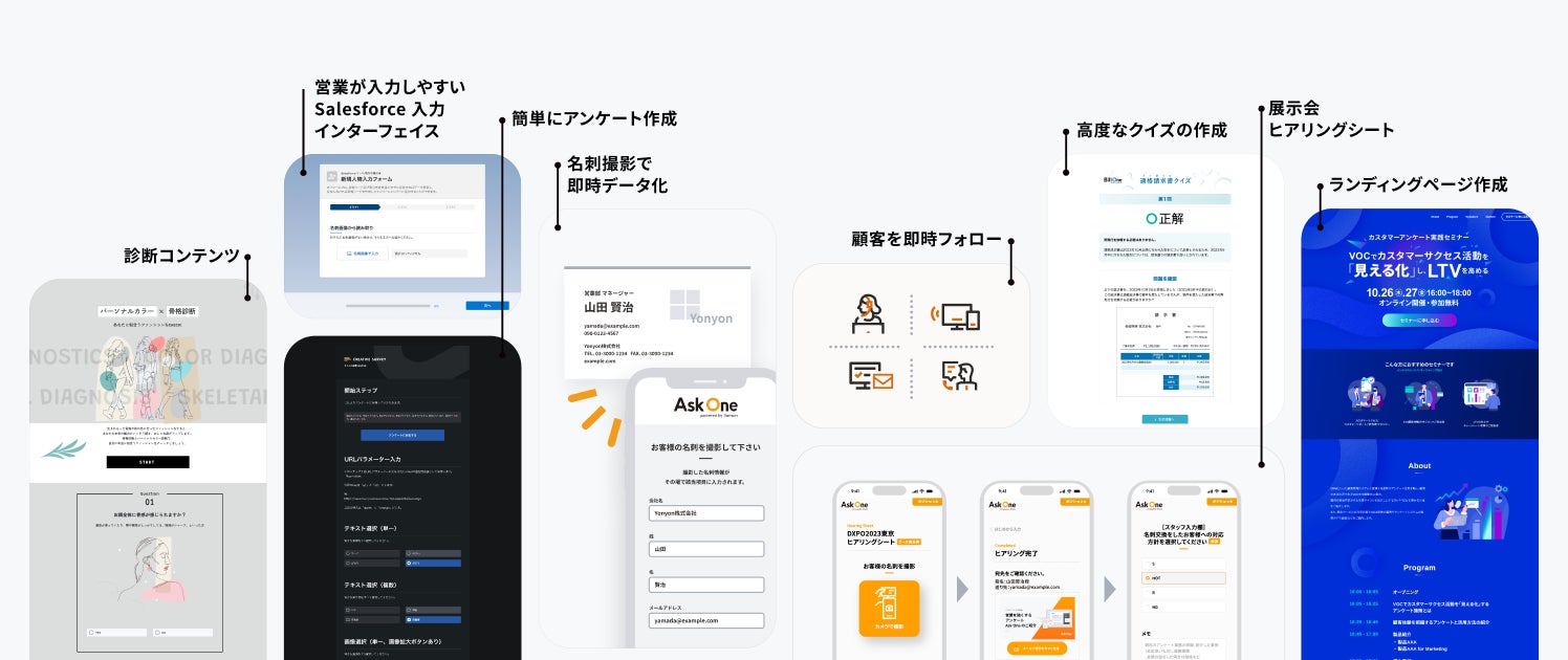 Ask Oneは23種類の豊富な質問タイプ、分岐やスコアリングなどのロジック、デザインのカスタマイズ、Sansanのデータ化技術による名刺の読み取り機能などを組み合わせることで、様々な顧客接点で活用できる多種多様なユースケースと、ユーザー企業と共に構築したベストプラクティスを提供しています。