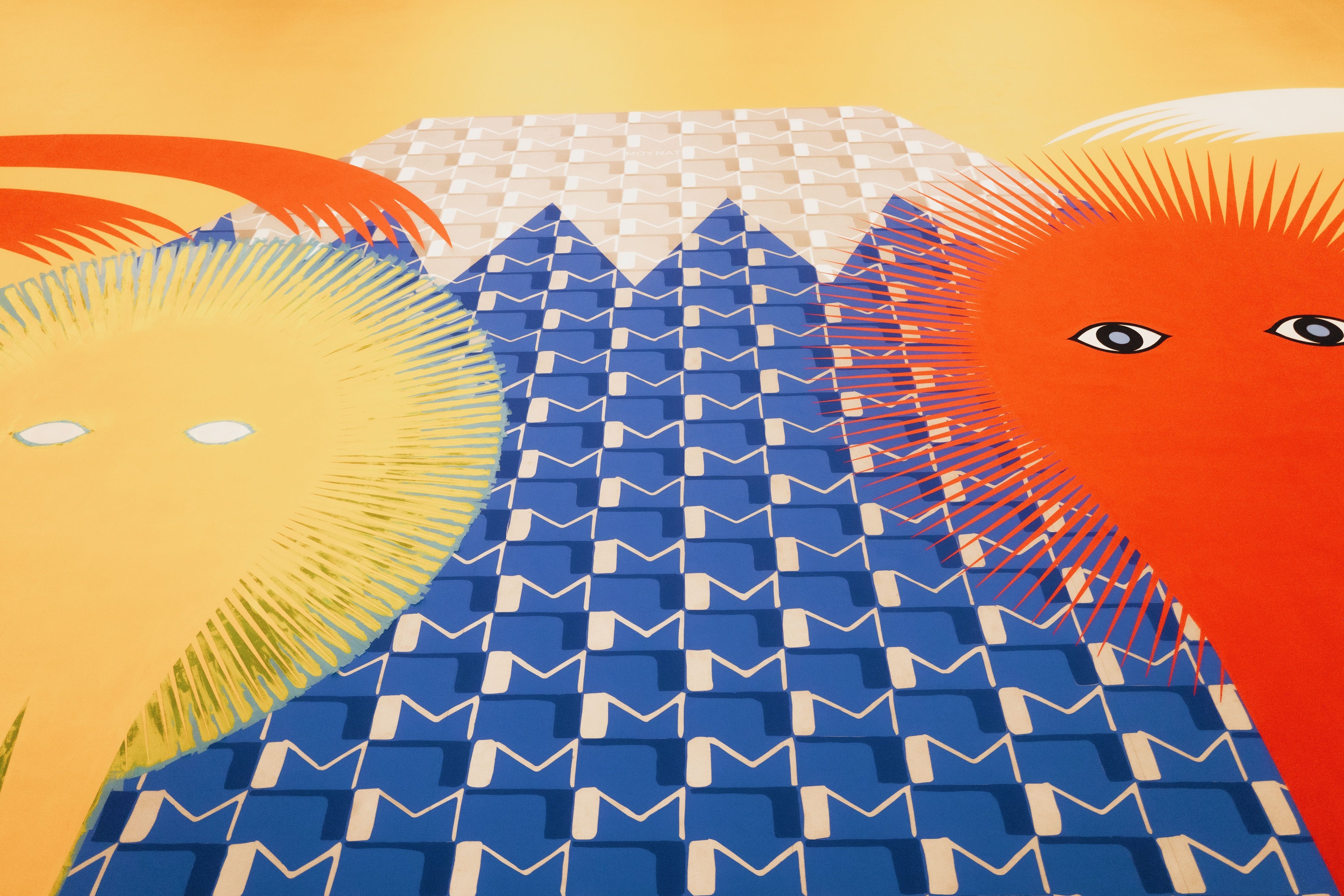 南座での、八代目尾上菊五郎丈、六代目尾上菊之助丈の襲名披露を記念して制作されたこの祝幕は、日本のデザイン界の巨匠である永井一正氏と日本デザインセンターが、モワナとコラボレーションし手がけたオリジナルアートワークです。連獅子という象徴的な歌舞伎演目と、モワナの“M”モノグラムで表現された富士山が描かれています。