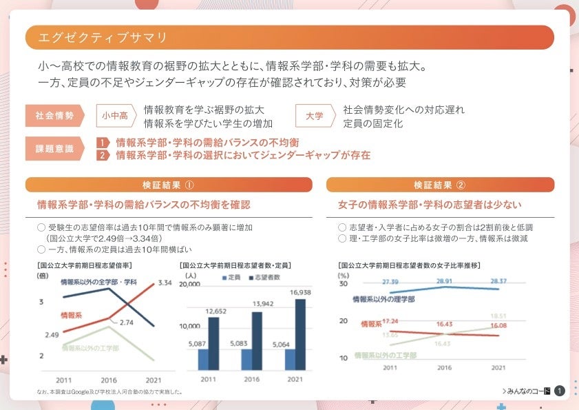 公教育における情報教育の発展を目指す特定非営利活動法人みんなのコード(東京都港区、代表理事:利根川 裕太、以下みんなのコード)は、 Google の協力のもと、日本国内の大学における情報系学部・学科の実態調査を実施し、レポートにまとめて公表しました。なお、この実態調査は学校法人河合塾(以下河合塾)の全統模試受験者の志望校データ(*1)の提供を受けて実施しました。
