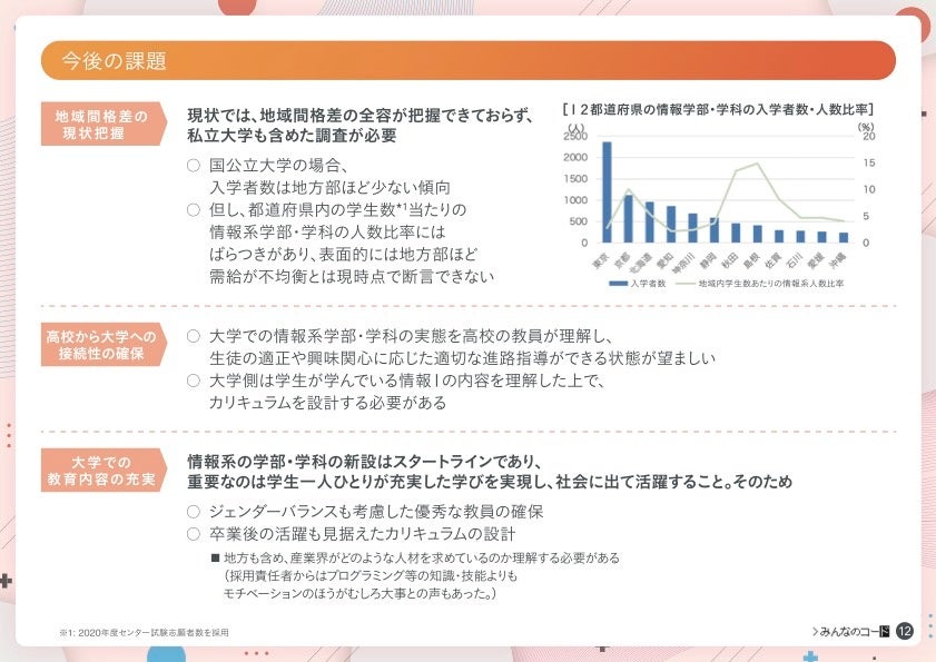 具体的な今後の対策として、デジタル等の成長分野への大学の再編・統合・拡充を促進する仕組みの構築、成長分野における定員増等が挙げられています。今回の調査で明らかになった情報系学部・学科の需給バランスの不均衡を改善するものと期待しています。