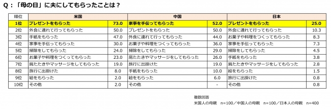 夫から母の日にしてもらったこと、第1位は米国と日本は「プレゼントをもらった」、中国は「家事を手伝ってもらった」。