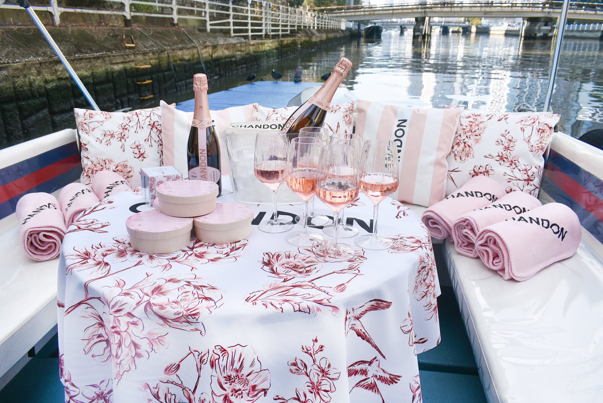 今年のクルーズでは、船内に春の訪れを感じられるラグジュアリーなデザインを採用。ピンク×ホワイトを基調としたテーブルクロスやクッション、シャンドン特製のブランケットなど、こだわりのアイテムで統一された空間が、目黒川の桜をより美しく引き立てます。