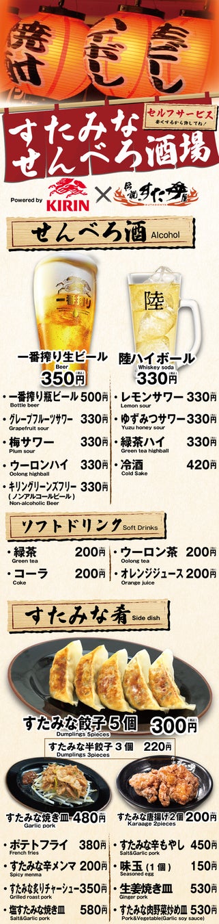 夜も賑わうという立地を活かし、当店ではお酒や肴も豊富にご用意しております。“すたみなせんべろ酒場”と銘打ち、一杯平均で300円台とお求めやすい価格でご提供、そのため1,000円台でお酒や肴をお楽しみいただけます。通常の路面店舗では、ビール類の販売のみに留まっておりましたが、当店では、『一番搾り』をはじめ、各種サワーやハイボール、お酒のお供にすた丼屋ならではのニンニク満点の『すたみな餃子』や『すたみな唐揚げ』、すた丼に使用しているお肉を使用した『すたみな焼き皿』など、唯一無二な“すたみな肴”を取り揃えております。