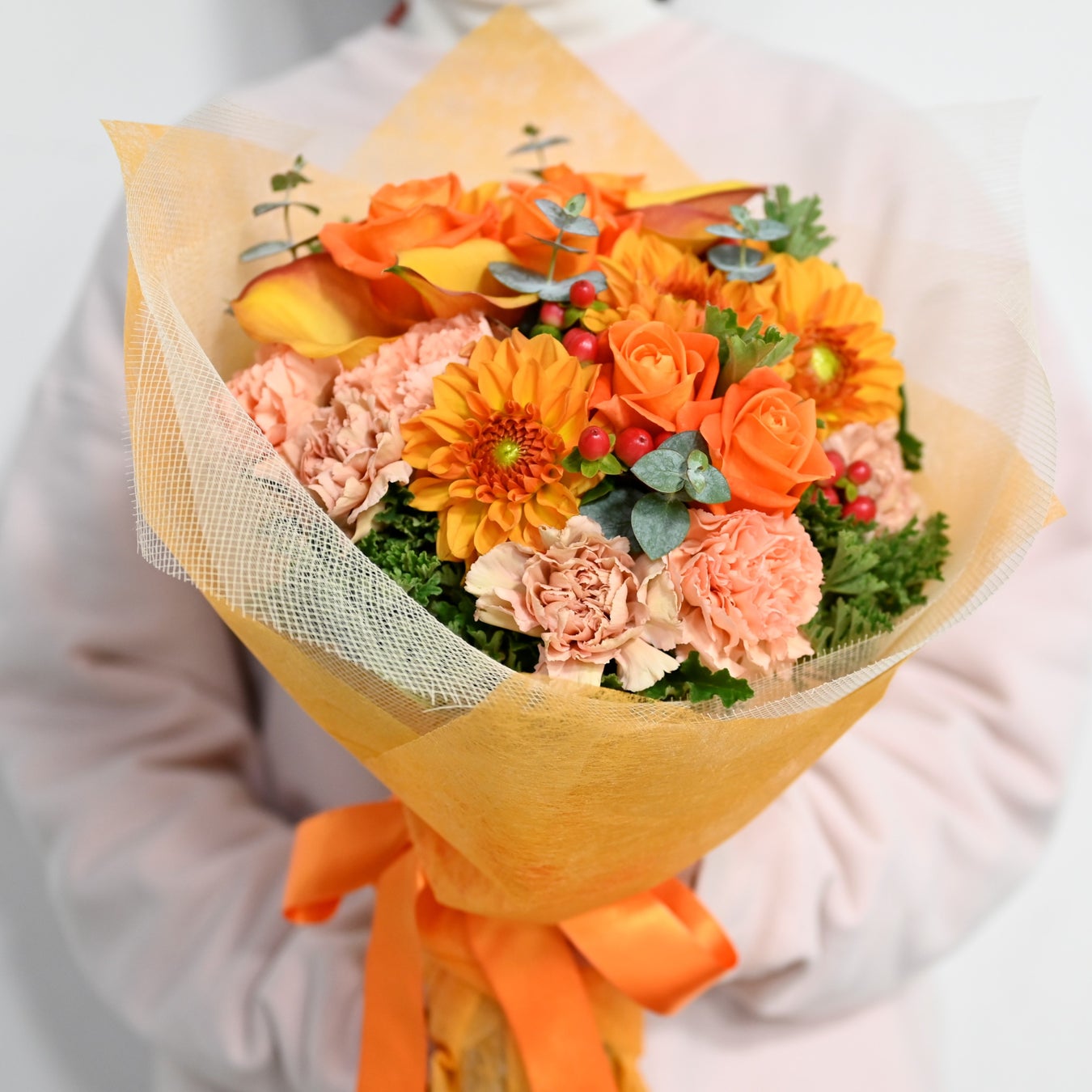 特別デザインの花束は「甘すぎず大人っぽい雰囲気にしたい」という土屋さんの意向をもとに、花キューピットのフローリストがサポートしながら制作されました。バラをメインにカーネーションやダリアなどオレンジ色で統一されたデザインとなりました。ぱっと見ただけで元気になれる、土屋太鳳さんのキャラクターをそのまま表現したような花束が完成しました。