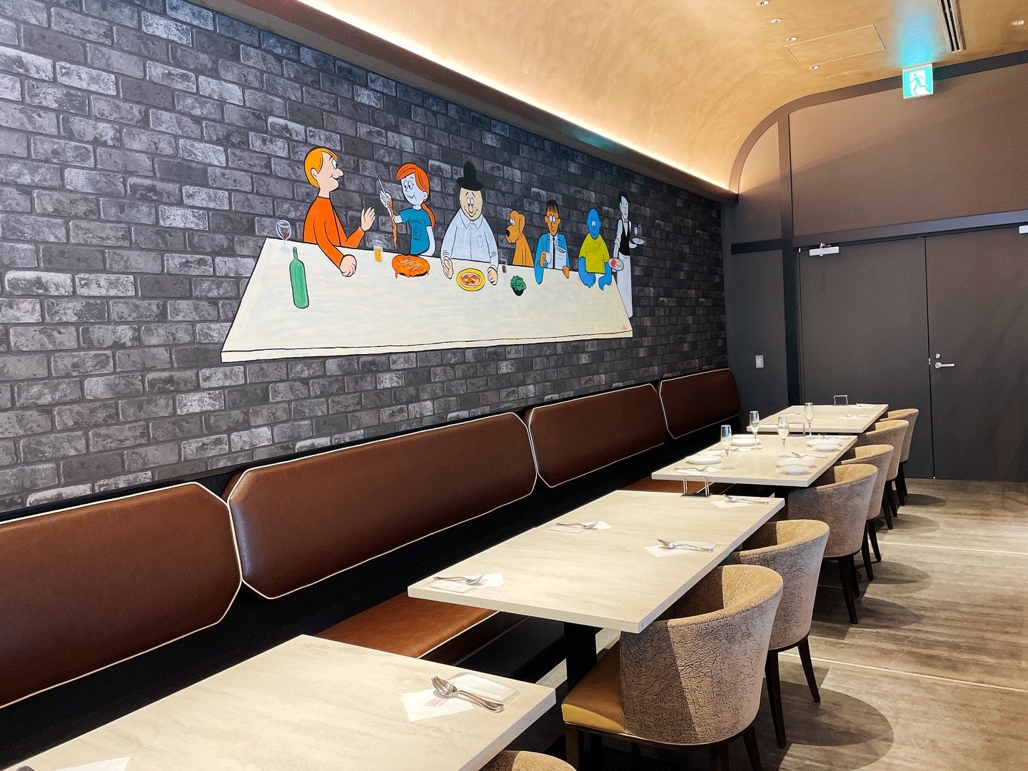 女性がひとりでも楽しめる新しいカウンター席を設置。多彩な利用シーンに対応する店内、壁にはキャラクターデザイナーRyu Ambe氏によるアート
