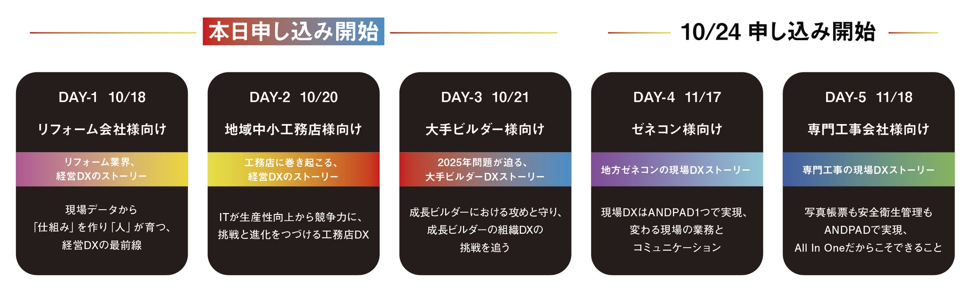会期中の5日間は、各日毎に建設業界の中でも業界を分け、各業界における建設DXの最先端をより深掘りいたします。また、本日カンファレンスの前半3日間(10月18日・20日・ 21日)の申し込みを開始いたします。