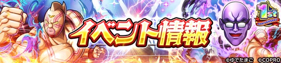 株式会社コプロ(東京都渋谷区 代表取締役:川島孝一郎)は、『キン肉マン 極・タッグ乱舞』で6月18日(水)より『キン肉マン 極・タッグ乱舞1周年イベント』の開催をお知らせ致します。新超人には待望のマッスル・スパークが使用できるキン肉マンが遂に登場!更にザ・サムライ、カオス・アヴェニールに加えてキン肉マンスーパー・フェニックスも復刻で登場!