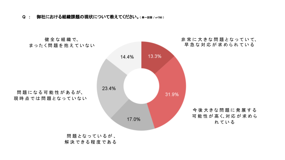 人材育成、離職率、従業員満足度などの組織課題に対して、緊急に対応が必要視される「非常に大きな問題となっていて、早急な対応が求められている」企業が13.3%、「今後大きな問題に発展する可能性が高く、対応が求められている」が31.9%と回答しています。