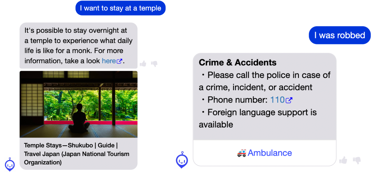 多言語AIチャットボットで、観光や安全・災害に関する必要な情報を、訪日旅行者にスムーズに提供。インバウンド拡大の後押し、現場の問い合わせに対する対応負荷の軽減を可能に。