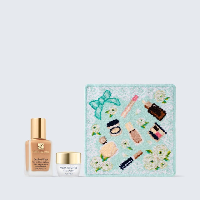 くずれない支持率No.1のリクイッド ファンデーション「ダブル ウェア」の現品をメインに、昨年9月に発売した、エスティ ローダーが初めて日本で研究・開発・生産し、肌の水分保持能を改善させる医薬部外品の新しいスキンケア ライン「アクア チャージ」のミルキー クリームのスペシャル サイズ、そしてエスティ ローダー×フェイラー コラボレーション限定ハンカチをセット。この春、スキンケアとベースメークの両方から完璧な肌を叶える特別なセットです。