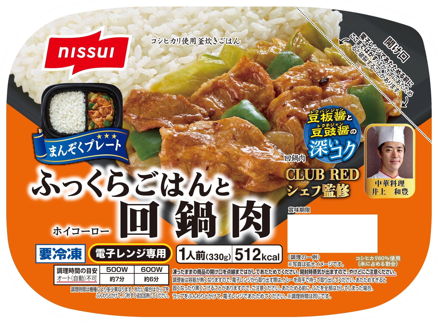 商品特徴 | ・白いごはんと、豚肉・キャベツ・ピーマン・たまねぎを使った回鍋肉をセットにしました。 ・CLUB RED(※1) 井上和豊シェフ(※2)が監修しています。・ごはんはコシヒカリをブレンドした米を釜炊きして、ふっくら仕上げました。 ・豆豉醤と豆板醤に独自技術「香りアップ製法」を使用し、旨みとコクを引き立てました。 ・うるち米から作られた中華調味料「酒醸(チューニャン)」を使用し、まろやかな甘みとコクを加えています。 ・キャベツはオーブンで蒸し焼きにし、玉ねぎは甘みと食感が出るようカットサイズにこだわりました。 ・白ごはんとおかずが混ざらず、それぞれのおいしさを味わえるようトレーに仕切りを付けています。 ・トップフィルムを指定の位置まではがし、トレーごと電子レンジで加熱するだけで召しあがれます。 ・トレーの10%に植物由来素材を使用しています。 ・外装のインキの10%に植物由来原料を使用しています。 |