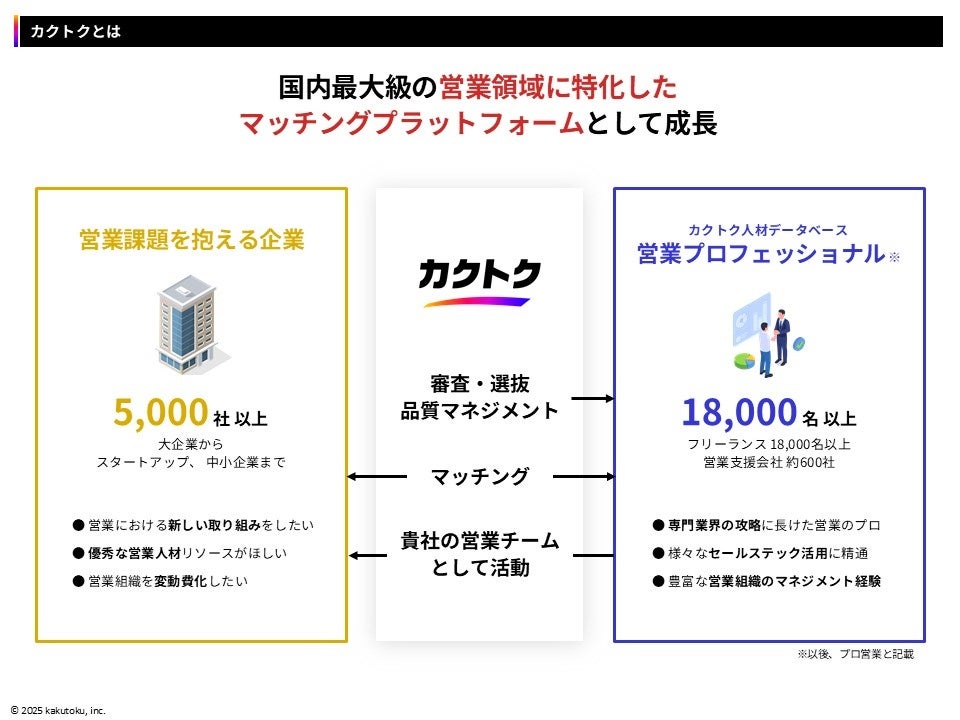 「カクトク」は、魅力的な商品やサービスを持ちながら営業に課題を抱える企業と、営業経験や業界知見が豊富な”プロ営業”をつなぐ日本最大級の営業マッチングプラットフォームです。1.8万人を超えるフリーランス・副業の営業人材、600社以上の営業代行会社が登録しており、企業側は最短3営業日で営業戦略などの営業支援領域から、新規開拓、クロージングなどの営業代行領域を含む、すべての営業プロセスをアウトソースすることができます。