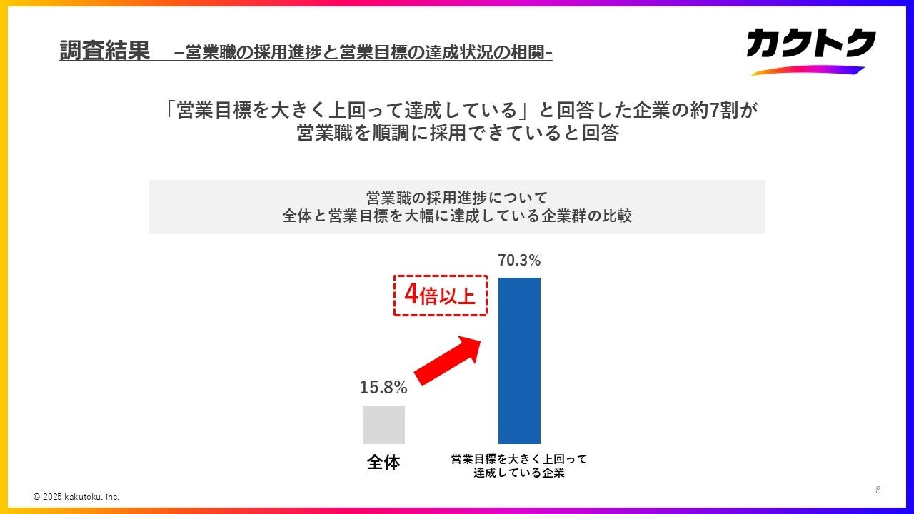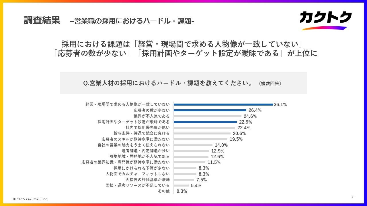 日本最大級の営業マッチングプラットフォーム「カクトク」を運営するカクトク株式会社(本社:大分県別府市、代表取締役:満田 聖也、以下「カクトク」)は、営業に関わる経営者・会社員500名を対象に「営業職の採用に関する調査」を実施しました。