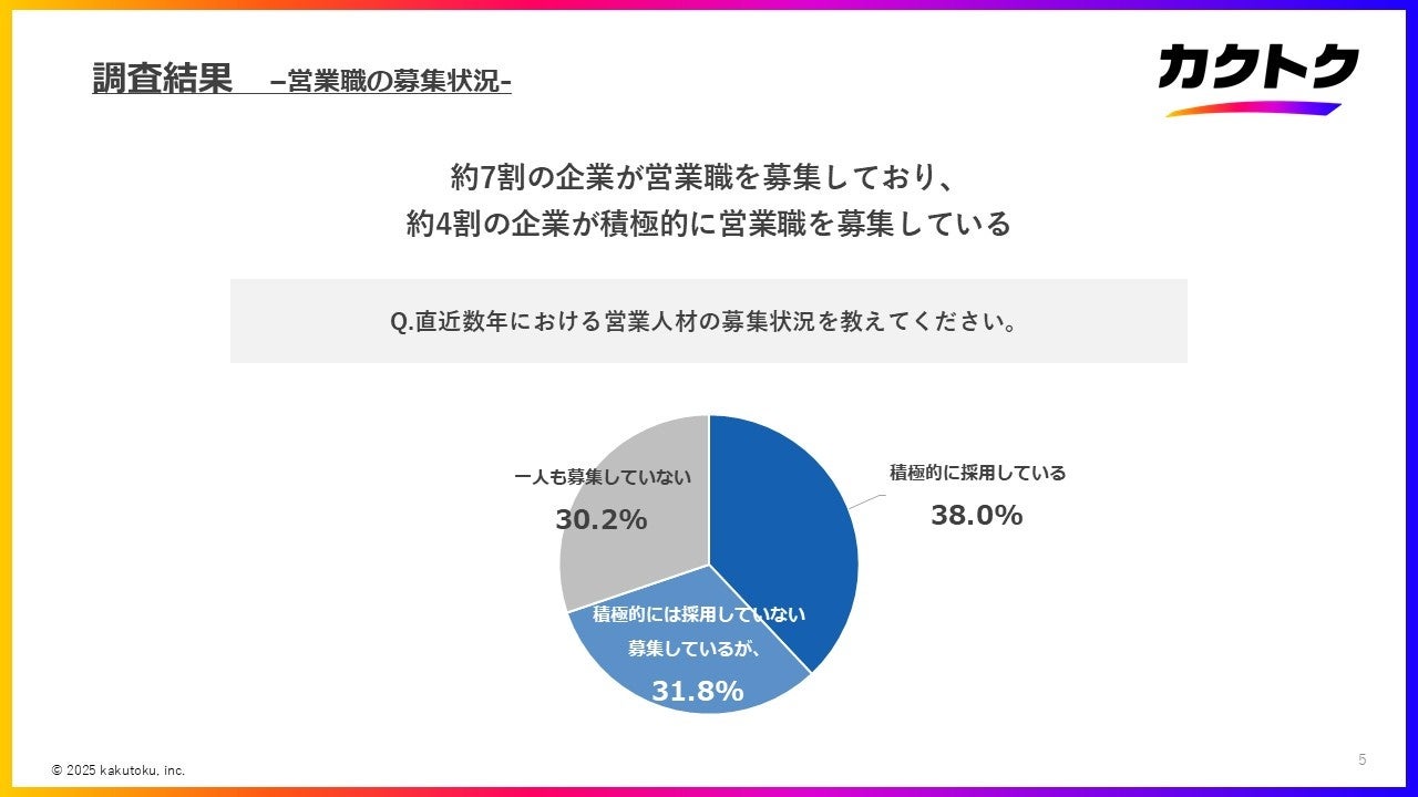 1.約7割の企業が営業職を募集しており、約4割の企業が積極的に営業職を募集している。