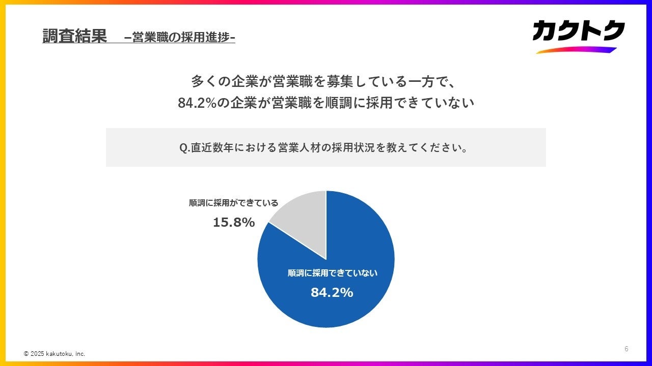営業職の採用進捗に関して、多くの企業が営業職を募集している一方で、84.2%の企業が営業職を順調に採用できていない実情が明らかになりました。