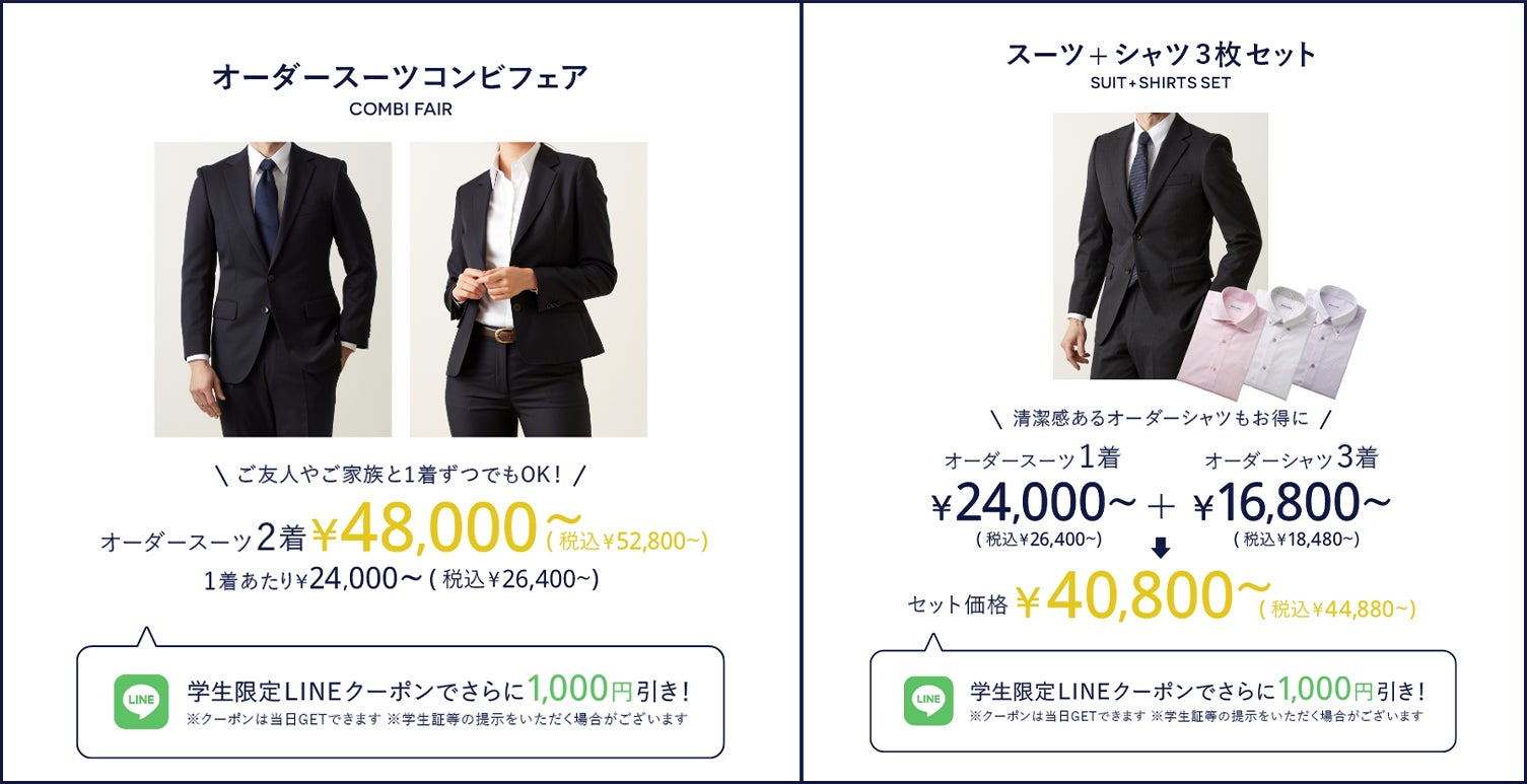 礼服と1着ずつ、ご友人様やご家族と1着ずつ、シャツとスーツなどを組み合わることでさらにお得。▼フェアの詳細はこちら