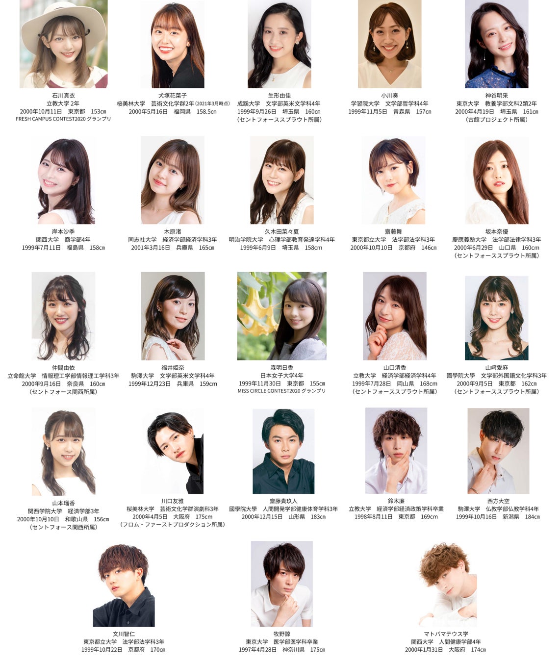 この新CMでは同院がスポンサードを行なっている全国の『ミスキャンパス・ミスターキャンパスコンテスト』で2020年度のグランプリに輝いた14大学21コンテストの受賞者、ならびに日本一の新入生を決める『FRESH CAMPUS CONTEST 2020』、日本一の大学サークルのミスを決める『MISS CIRCLE CONTEST 2020』、日本一のミス・ミスターを決める『MISS OF MISS CAMPUS QUEEN CONTEST 2021』『MR OF MR CAMPUS CONTEST 2021』の各グランプリ受賞者たちへ副賞として【TVCM出演権】を贈呈。そのうちの総勢23名の大学生が出演しています。