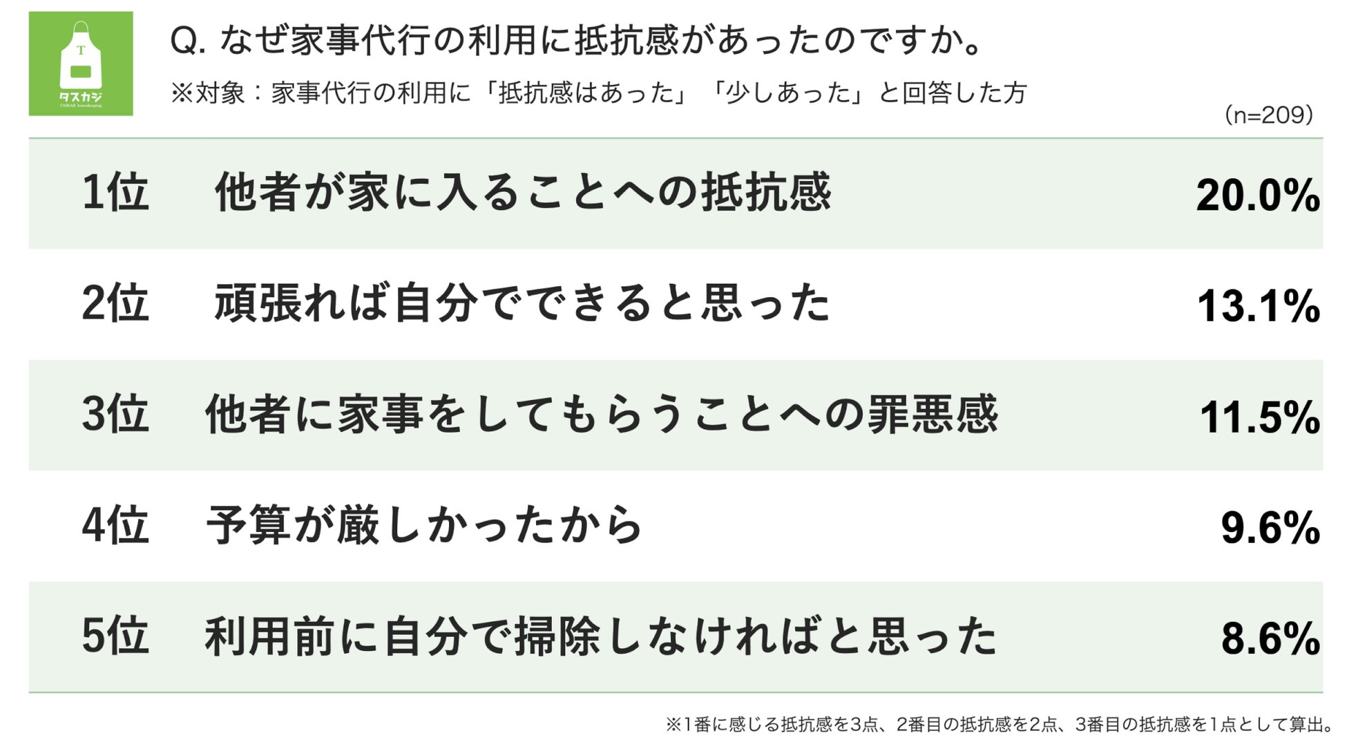 家事代行を利用する前に抵抗感を持っていた人は、約70%に上りました。また、抵抗感の理由としては「他者が家に入ることへの抵抗感」「頑張れば自分でできると思った」「他者に家事をしてもらうことへの罪悪感」続き、家事代行利用までには想像以上に高い壁が立ちはだかっています。