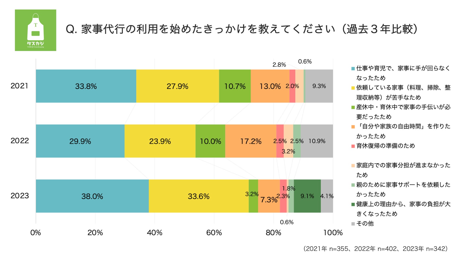 子育てをしている共働き世帯の利用者がメイン層となるタスカジにおいて、家事代行利用のきっかけで一番多いのが「仕事や育児で家事に手が回らなくなった」でした。